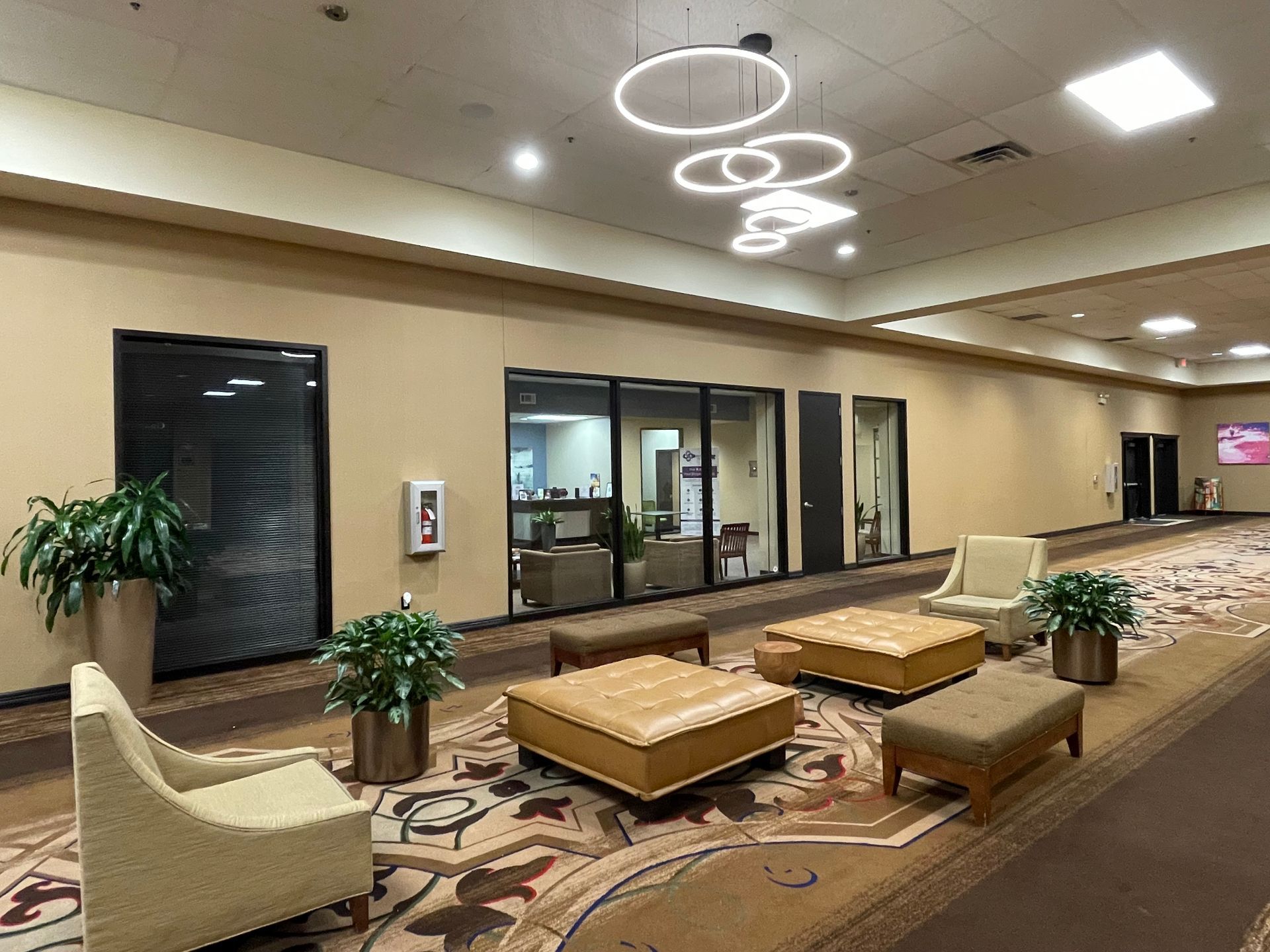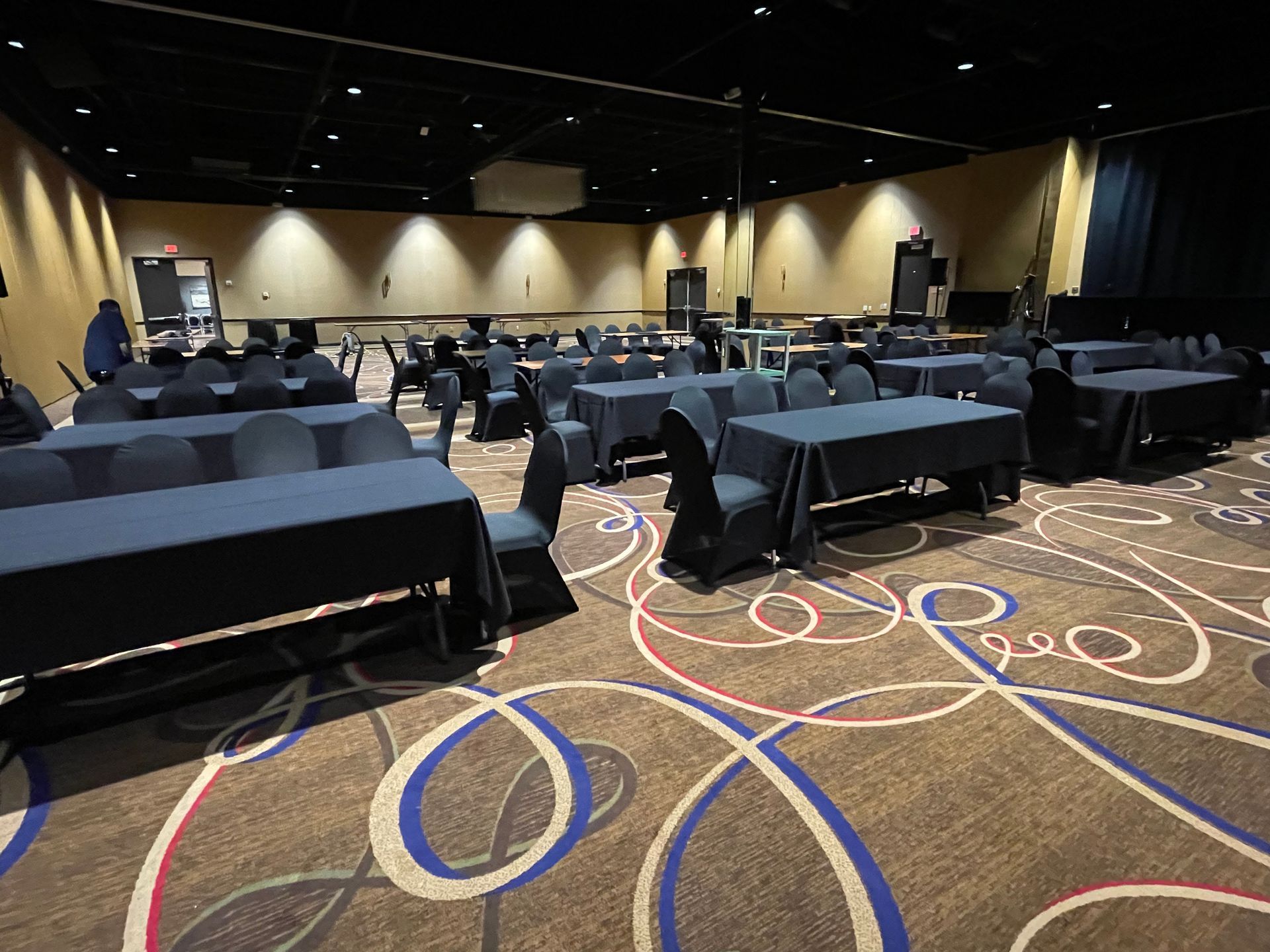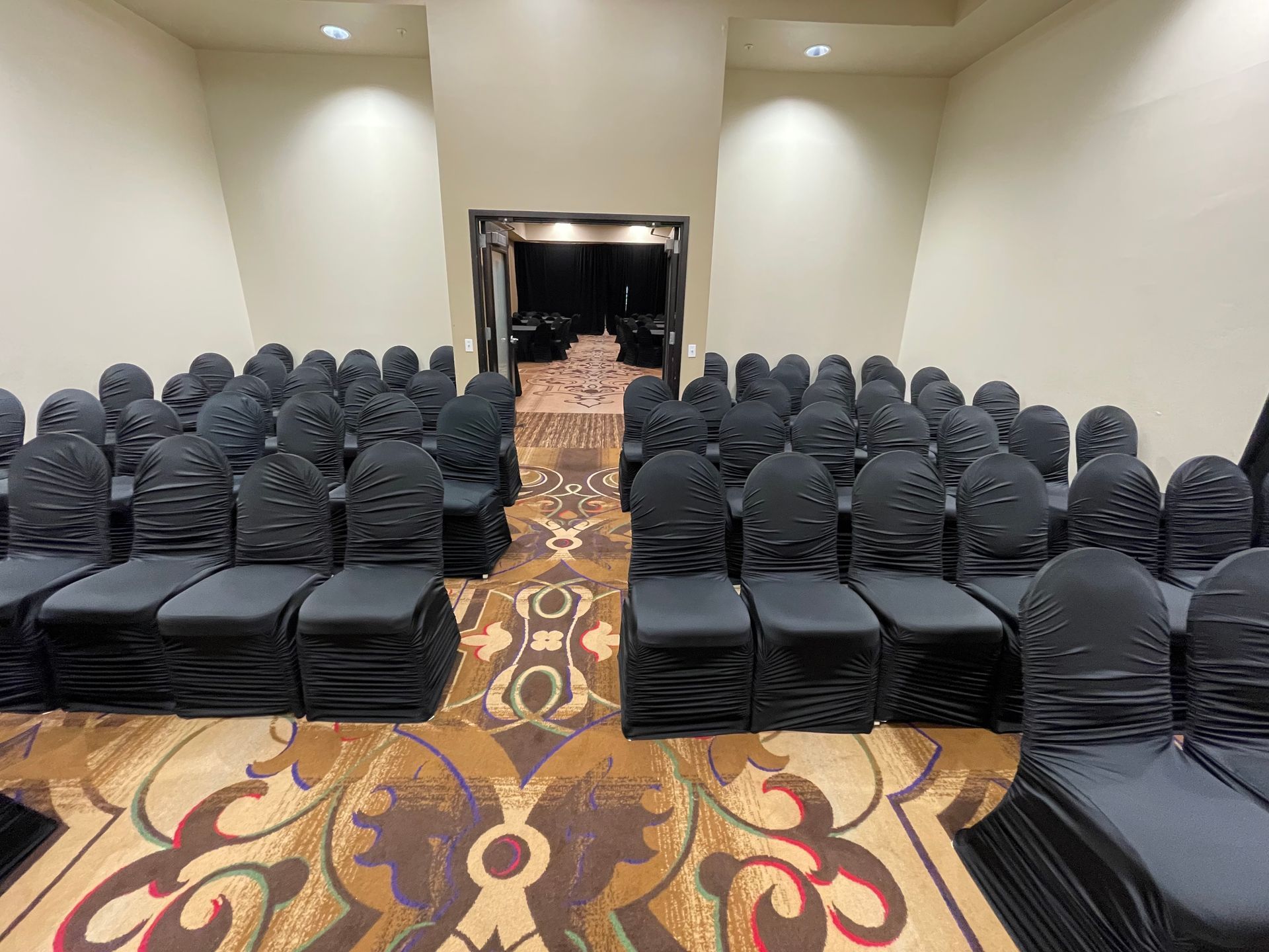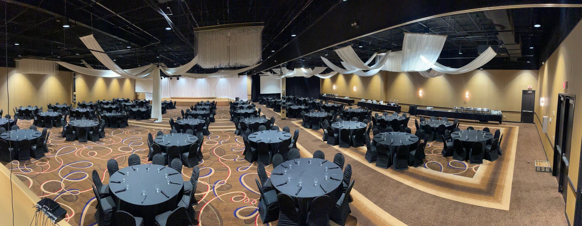 Complementary Exclusives: Ample Parking, Event Stage, Stage Draping, and Lighting, Warm Lit Chandeliers, Wall Sconces, Dimmable Lighting, & 6,000 sq. ft. Foyer