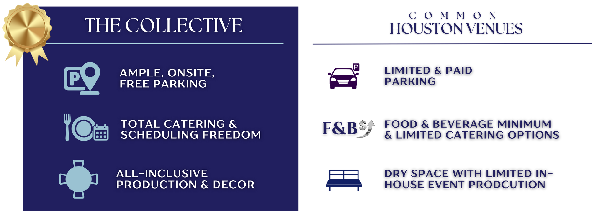 While Houston has many venues, very few offer a 300+ guest capacity paired with the seamless, flexible experience we provide. We’ve built our space to eliminate the hurdles other venues create.